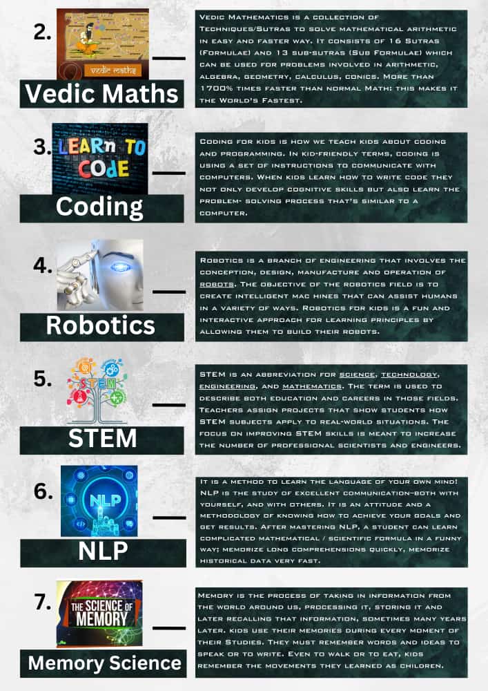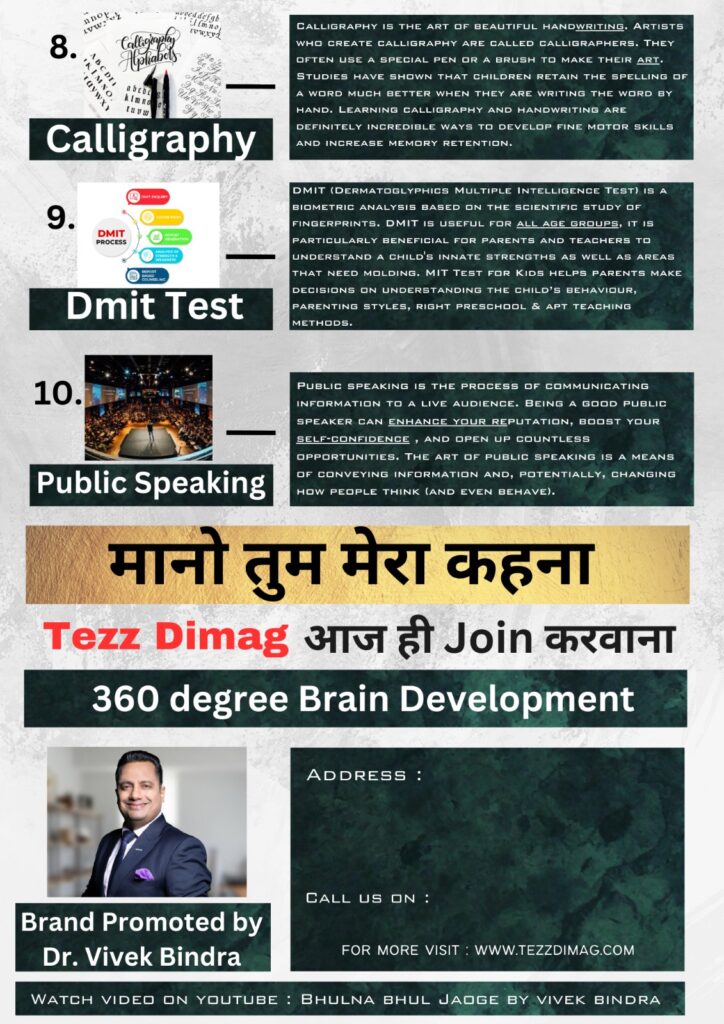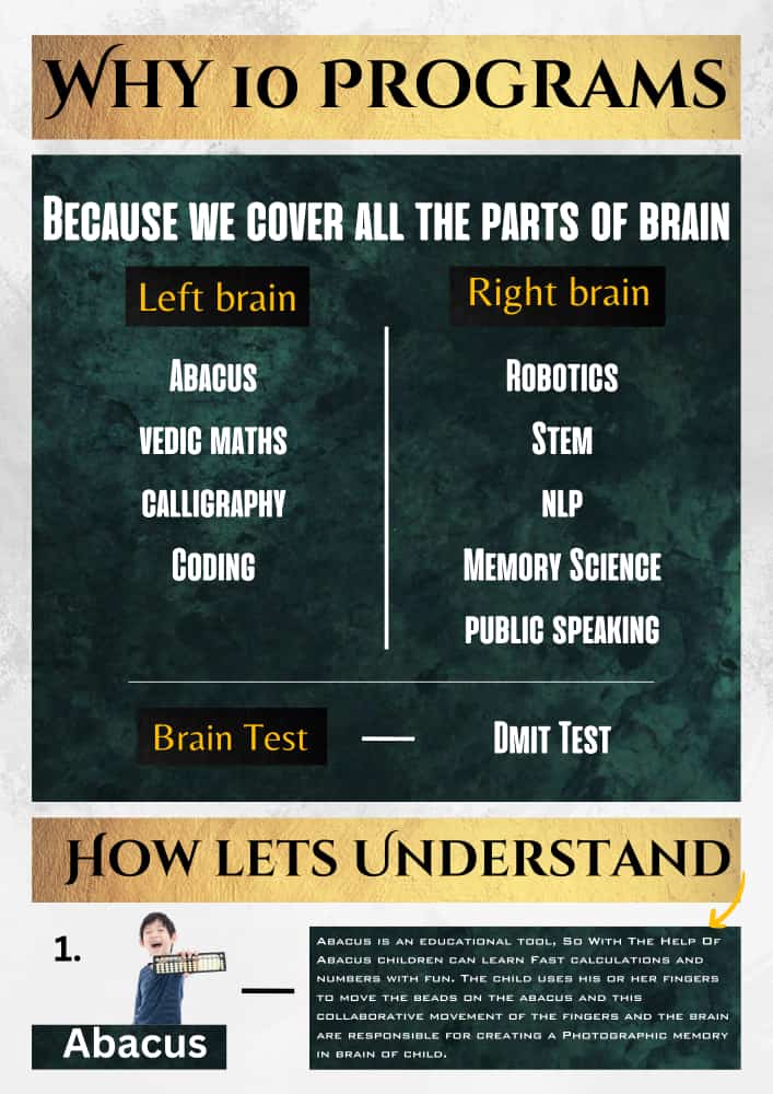 At Tezz Dimag, we empower young minds with essential 21st-century skills through specialized programs in Abacus, Vedic maths, Coding, Robotics, STEM, Memory science, NLP, calligraphy, Public speaking, and DMIT. Using engaging, science-backed methods, we nurture cognitive abilities, creativity, and confidence